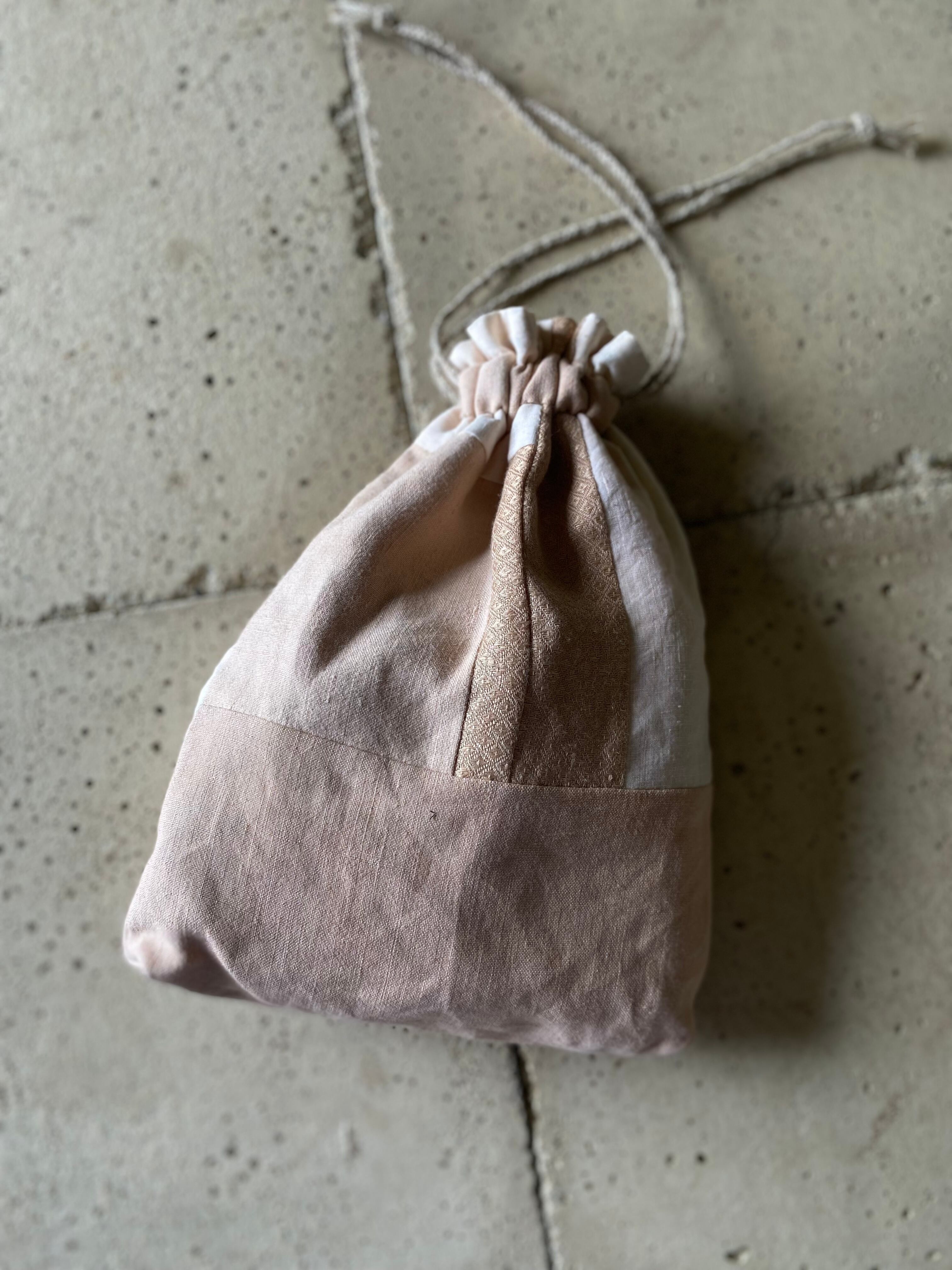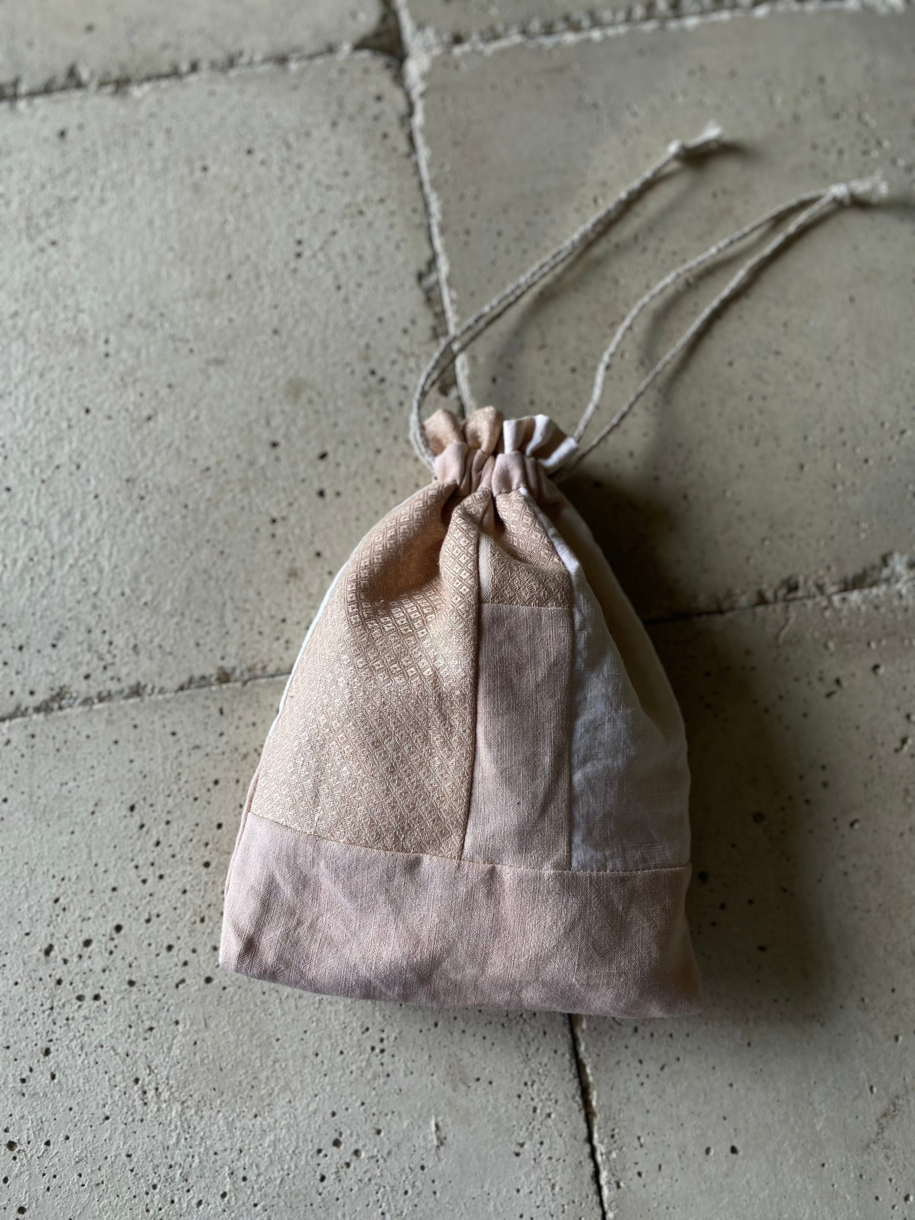 布を余す所なく使う人の心が美しい、その美しさが内包された巾着鞄です。